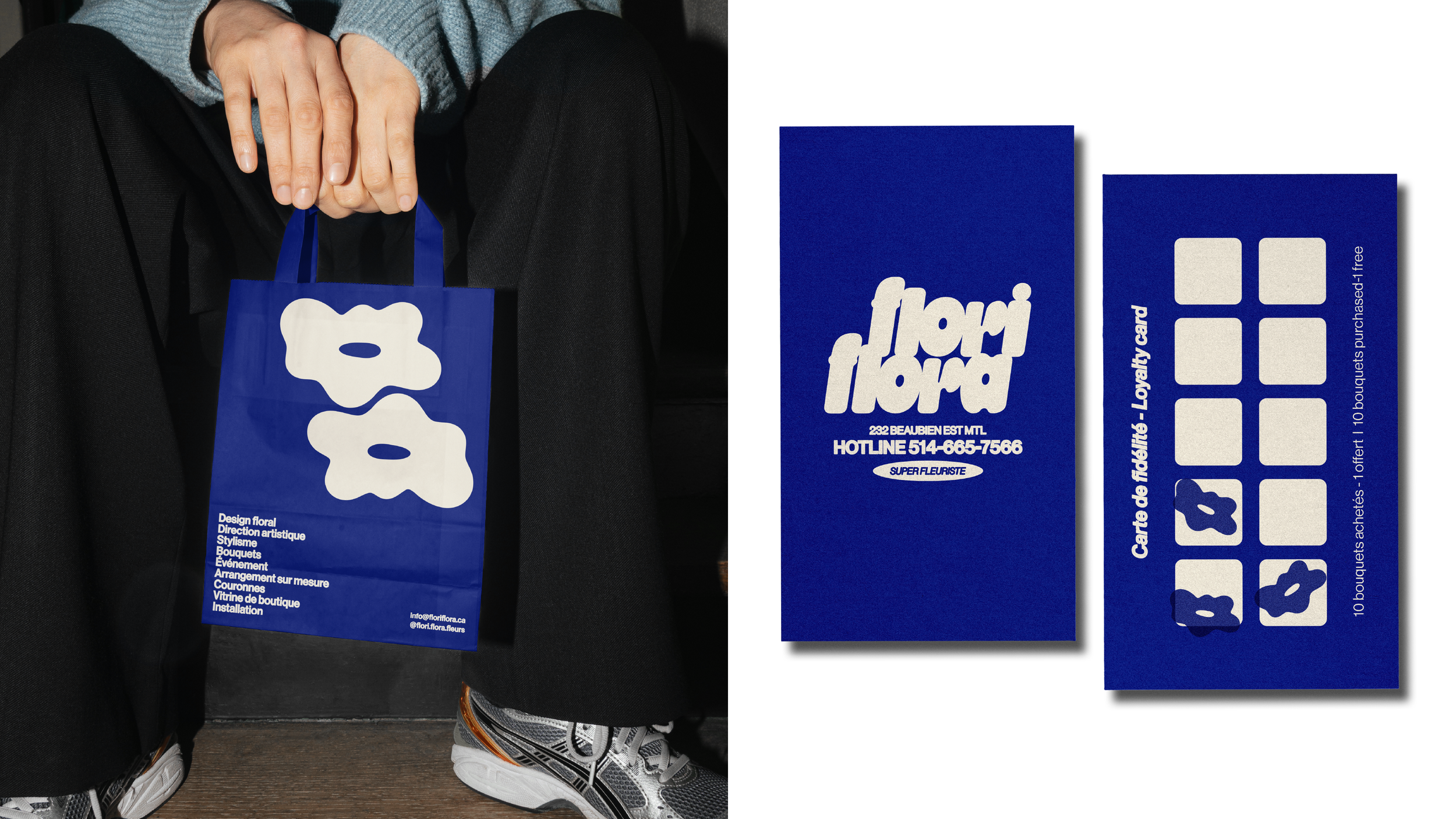 Flori Flora est un fleuriste nouvelle génération qui revendique une approche joyeuse, directe et décomplexée de la composition florale. Pour accompagner leur lancement, nous avons imaginé une identité visuelle à la fois audacieuse et accessible, capable de se démarquer dans un univers souvent trop lisse ou trop sophistiqué. L’univers graphique s’articule autour d’un bleu franc et d’une typographie généreuse, arrondie, presque naïve, qui évoque à la fois la spontanéité, l’émotion et l’enthousiasme. Chaque élément — du logo jusqu’aux étiquettes en passant par les sacs, autocollants, textiles ou cartes — est conçu comme un support d’expression pop, ludique et hautement reconnaissable. Les motifs damiers, les slogans enjoués (“Buy me flowers”, “Super fleuriste”) et les détails illustrés participent à construire un langage visuel cohérent et immédiat, qui met en valeur à la fois le produit et l’attitude de la marque. Le résultat est une identité forte et engageante, pensée pour séduire une clientèle urbaine, visuelle et connectée, qui voit dans le geste d’offrir des fleurs autant un acte d’affection qu’un moment d’affirmation stylistique.